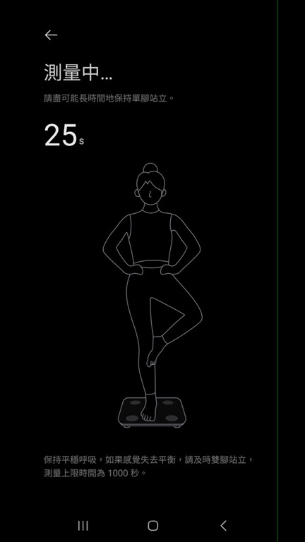 另外還有幾項量測也滿有趣的,像是平衡測試,就是讓你用單腳站上體脂計,來測量平衡感。只要能超過 20 秒,就是有很好的表現。