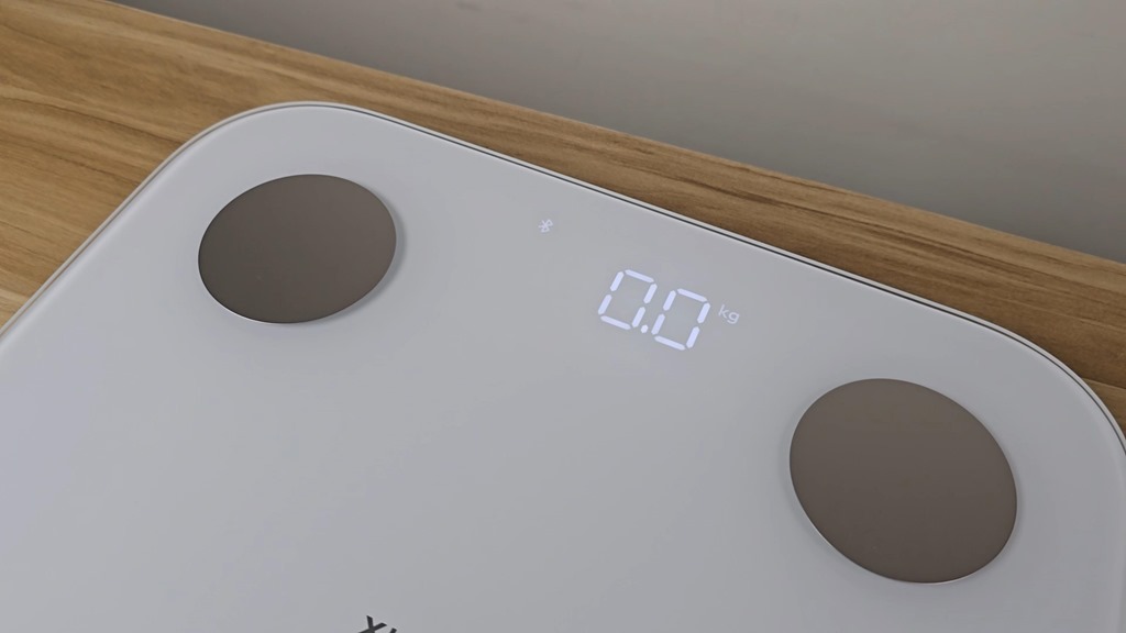 小米這次引進台灣這款體脂計型號是 S400,既然是體脂計,就是體重與體脂可以一起量測的,不過他不只有給你這兩個數字,而是有更多身體組成的指標。外觀上,就與一般體脂計沒什麼差別,在正面有著加大面積電極貼片,讓腳站上去時比較容易可以接觸到電極。