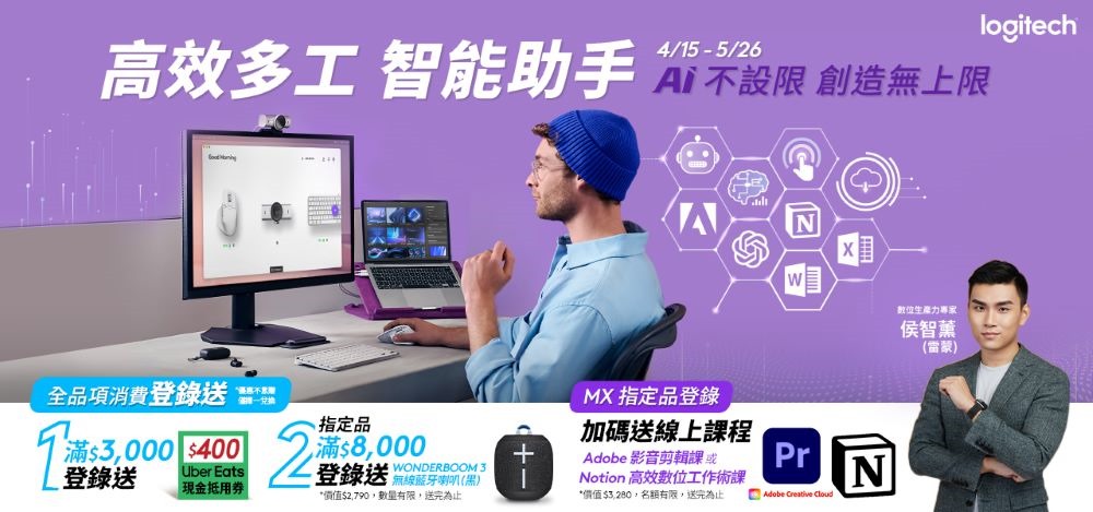 - 即日起至 5 月 26 日止,凡於指定通路購買 Logitech MX 高階商務品項,登錄發票就送Adobe Premiere Pro 影音剪輯線上直播課「PR 智能剪輯工作流,解放AI的影音生產力」(價值3,280元)或由數位生產力專家侯智薰雷蒙獨家推出的「Notion 高效數位工作術課」(價值3,280元)。