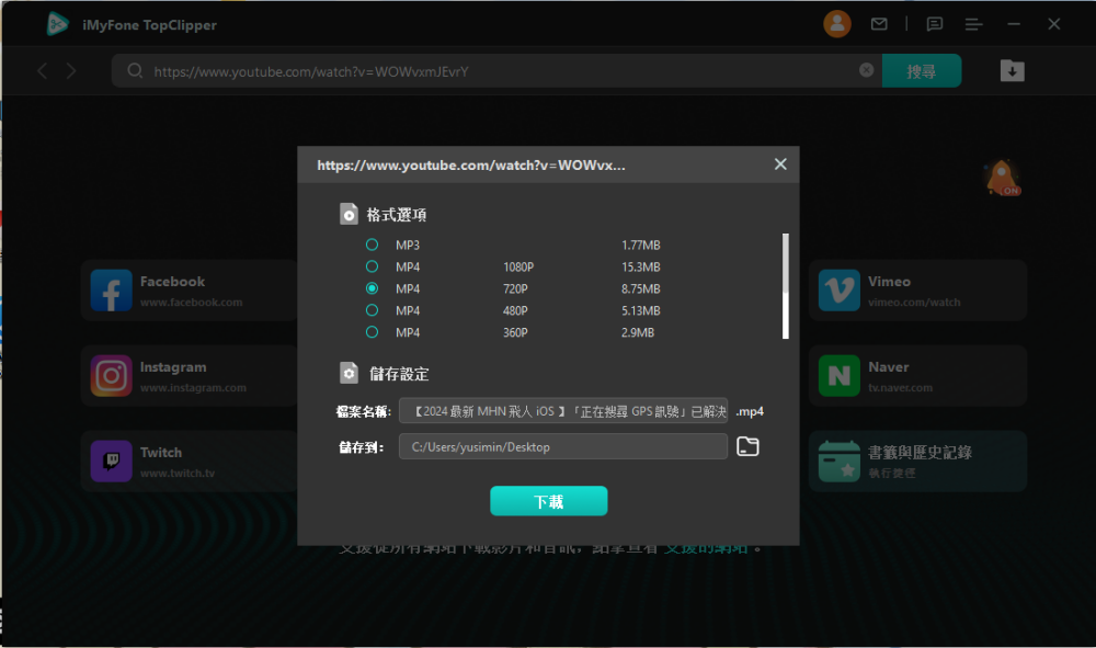 步驟3:此時,軟體將會彈出新的視窗,即可以根據需求點選影片的格式,然後再次點擊「下載」就可以在 YouTube 影片下載 MP4 。