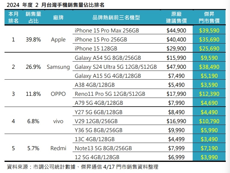 銷售排行的Top 5除了前兩名的蘋果與三星,第三至第五名分別為中國品牌OPPO、vivo和紅米,市佔率分別為11.8%、6.8%及5.7%。傑昇通信也分析,蘋果iPhone雖然還是第一,但實際銷售量及銷售額,較1月衰退了13%,而且雖然有促銷折扣,不過iPhone的用戶幾乎都在剛上市的時候就已經換好新機,因此換機潮很明顯的趨緩。其中最受歡迎的三款分別是iPhone 15 Pro Max(256GB)、iPhone 15 Pro(256GB)及iPhone 15(128GB),都是iPhone 15系列新機。