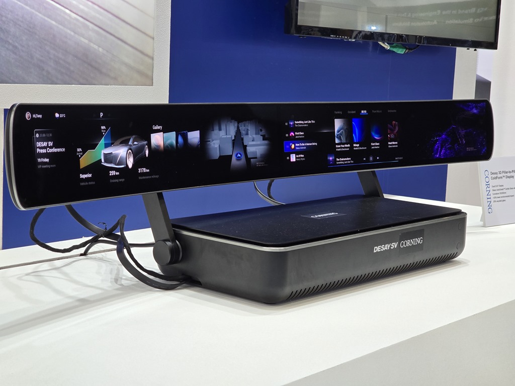 此次展出與 Desay SV 合作推出曲面顯示器,在冷彎成型保護玻璃下以兩面 23.6 吋顯示器組成車艙前螢幕,未來還能在冷彎玻璃下還能放入感應應器與鏡頭,創造更多可能。