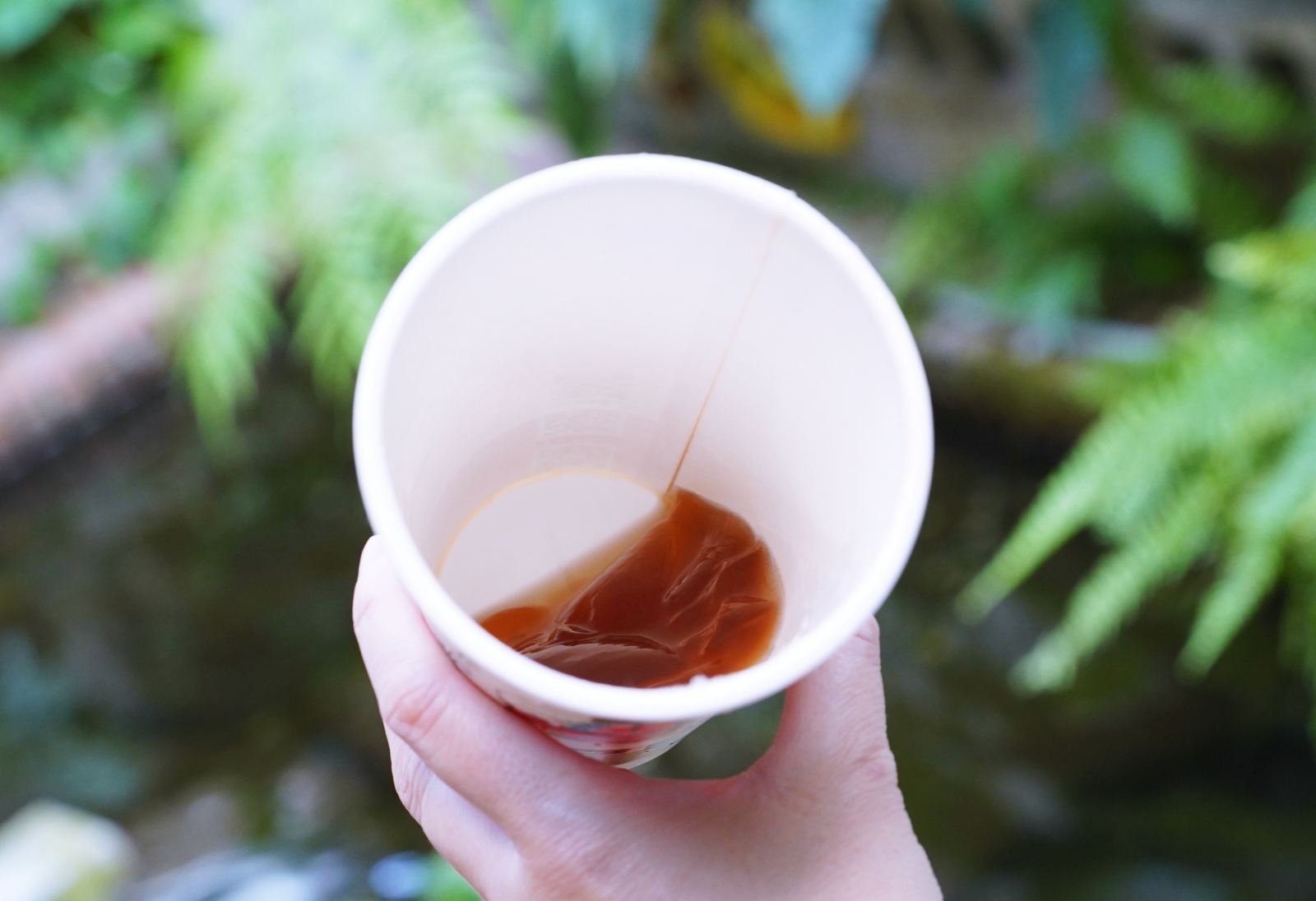 ▼茶聚的杯子、包材均通過 SGS 檢驗,紙杯有一定的硬度。通常紙杯封膜的黏合度沒有塑膠杯強,會有液體漏出的風險,但是買了四杯放在保冷袋,過程中一度倒置,都未見液體漏出。
