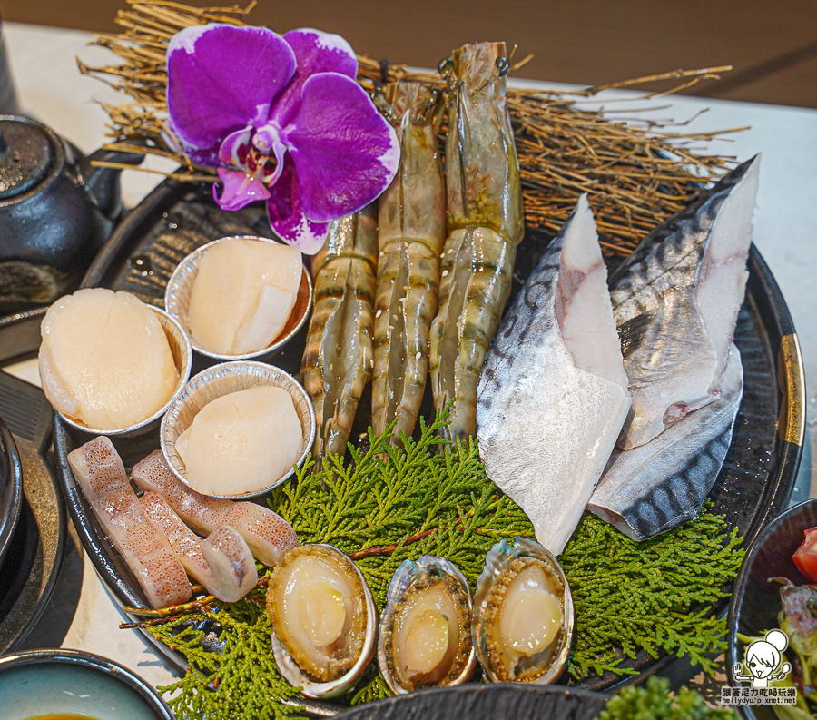 大鮮蝦、阿根廷魷魚、鹽漬挪威鯖魚、深海九孔鮑魚、日本扇貝