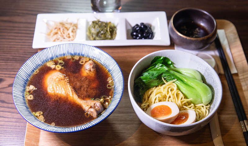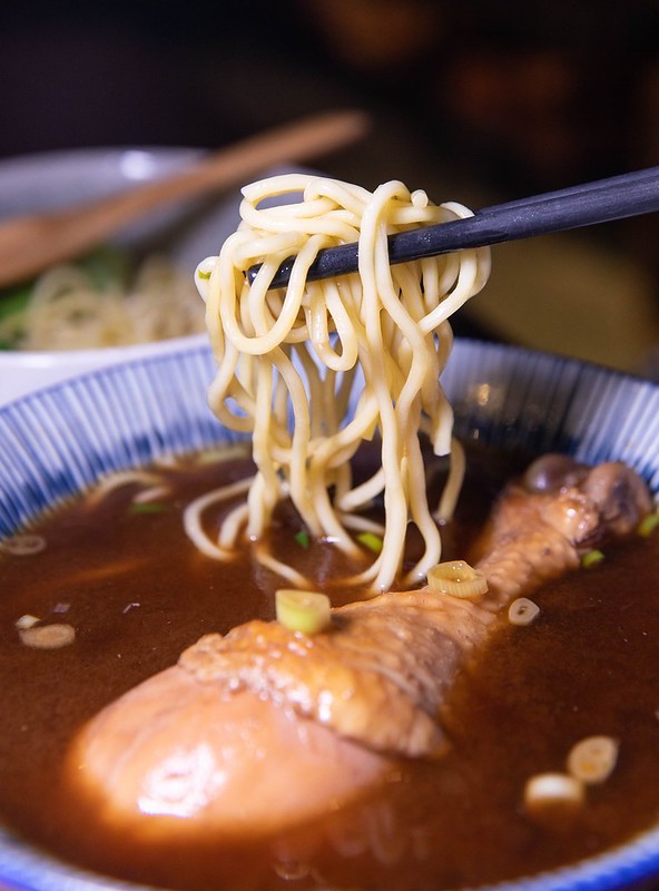 最後是台味麵食(380元),最後我點的是黑金蒜頭雞靜翅麵,上菜時是麵、湯分離,有一點像日式的沾麵,湯頭帶著滿滿的蒜香和雞湯甜,說是雞翅但裡面還有一隻肉質燉到軟嫩入味的棒棒腿,麵條帶點討喜的微咬勁,還附了清江菜和一顆不錯吃的半熟蛋。
