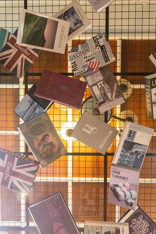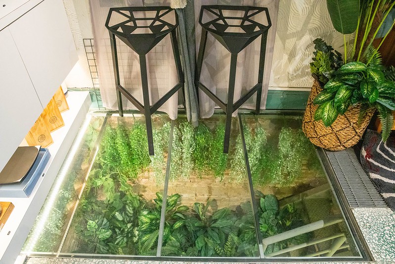 如今館內像作小型的文化博物館,有幾處很是特別的設計,如屋頂上的書、地板上透明玻璃下的綠色植物。