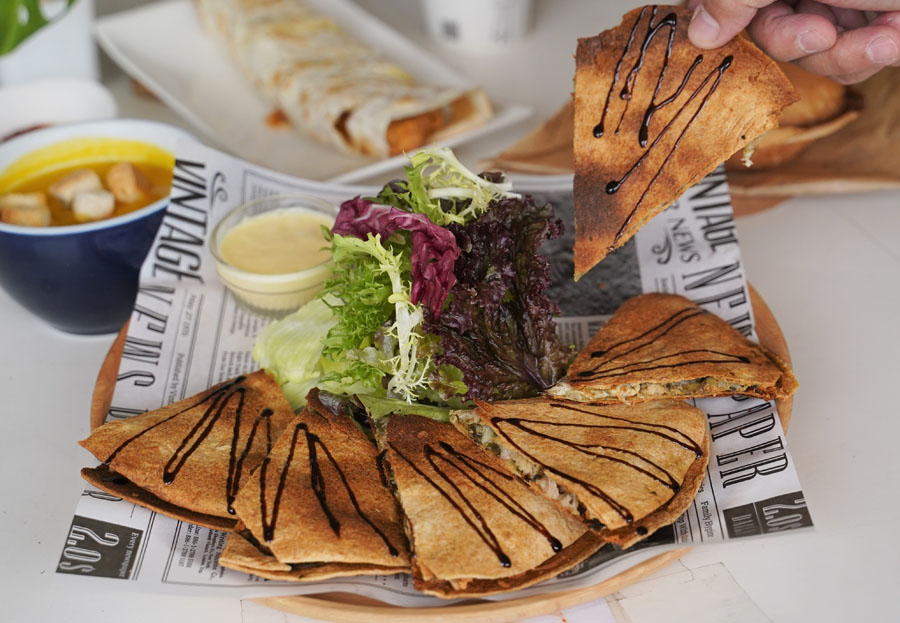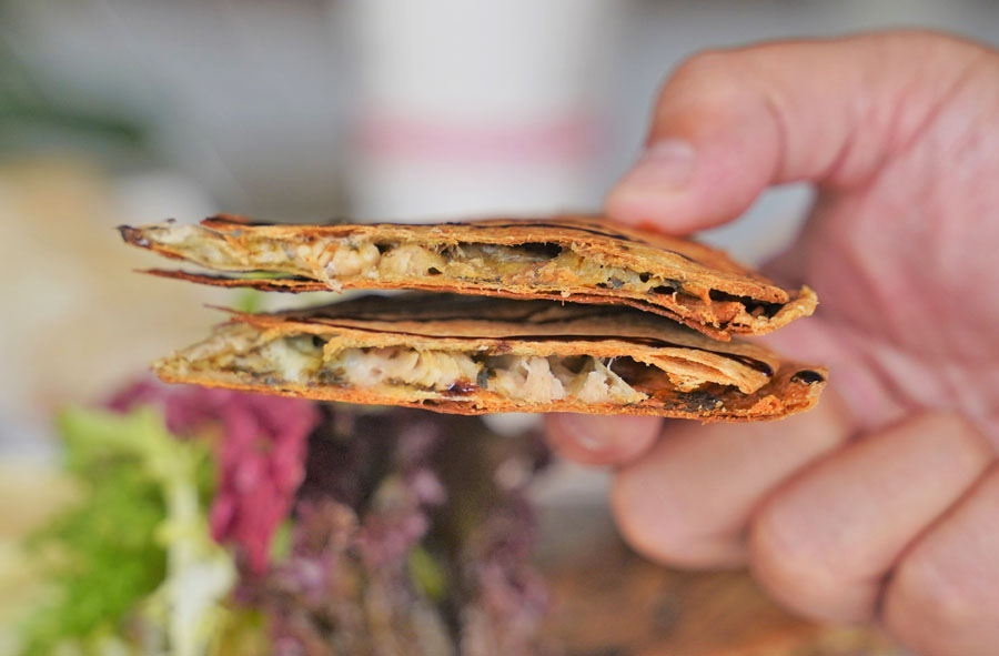 墨西哥餅皮是手工製作,中間夾入青醬煙燻雞肉