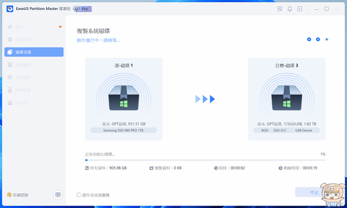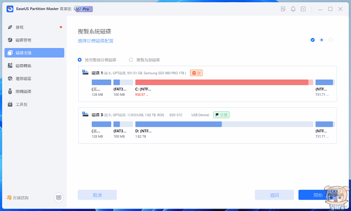 開啟 EaseUS Partition Master 操作就和前面在電腦上操作的一樣,選擇「磁碟克隆」,再選擇「複製磁碟」,最後選擇來源與目標磁碟後,點選「開始」就會開始複製啦!這裡一樣是要選對哦,不然資料都會不見!