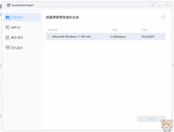 大家應該都有遇過Windows 莫名其妙的就開不了機,進來藍色的畫面,不管怎麼用Windows 本身的修復都還是不行,這個時候大家可以試試EaseUS Partition Master 的啟動修復功能,比Windows 內建的好用多了,除了啟動修復之外,另外也提供了UEFI啟動選項,指定BCD檔案,以及藍色畫面記錄!