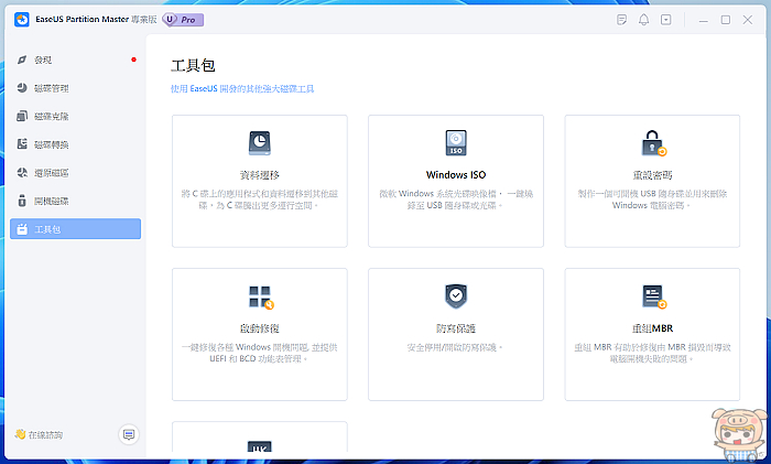 EaseUS Partition Master Free 最後一個選項「工具包」,裡面提供了一些好用的工具,如重設密碼,資料遷移、啟動修復、防寫保護、Windows ISO、重組MBR、4K對齊等好用的工具!尤其重設密碼當您不小心忘記電腦登入密碼時,透過它就能刪除電腦的密碼!真的不錯用!