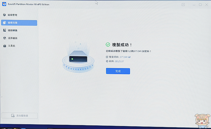 複製的過程和剛剛一樣,最後看到複製成功,那就表示完成啦,這次是371GB,耗時了25分鐘,因為這台筆電的速度和SSD的速度都比原本桌機的慢不少,所以耗費的時間比較久!