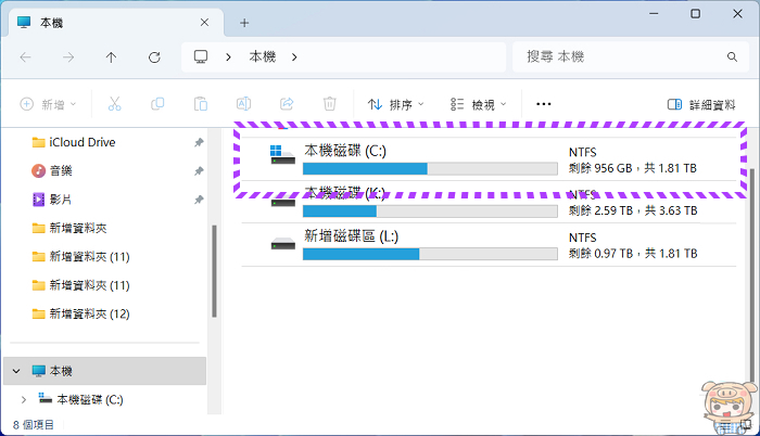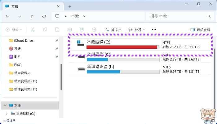 開機~~~一切正常,進入Windows 之後,看一下磁碟空間,原本只剩25GB的空間,而且也是出現紅色的警告,現在變成還有956GB的空間,還有一半的的空間可以使用,實在太棒了!