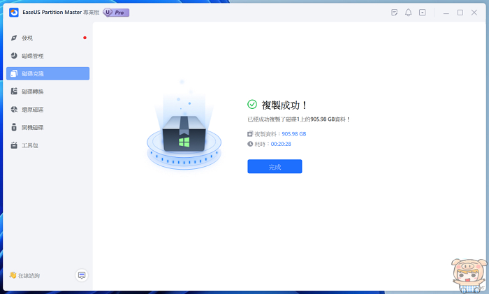 最後看到這個完成的畫面,表示搞定啦,這樣原本的系統就會完整的複製到新的SSD上啦,接著就是將舊的SSD移除,換上新的SSD!905GB的資料量,花了20分鐘複製完成!
