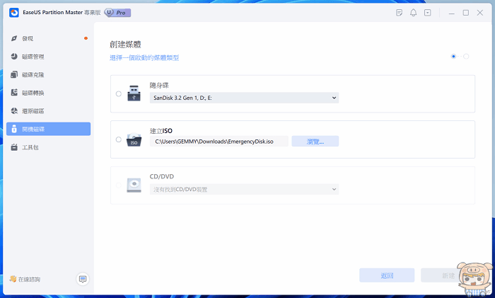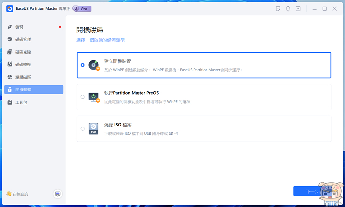 另外EaseUS Partition Master 也提供開機磁碟的製作,當您系統掛掉時,都可以透過EaseUS Partition Master Free 所建立的開機磁碟來救援裡面的資料!它提供了「建立開機裝置」「執行Partion Master PreOS」「燒錄ISO檔案」。