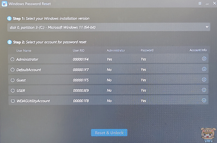 另外還有一個好用的功能,那就是重設密碼,總是不知道為何明明每天都在輸入的密碼,突然就無法登入,怎麼試就是無法登入,沒關系,這個時候只要使用 EaseUS Partition Master Free 的重設密碼功能,就能輕鬆變更密碼啦!執行Windows Password Reset 程式就會自動偵測出哪個磁碟有系統,上面有哪些使用者,是不是很厲害呀!