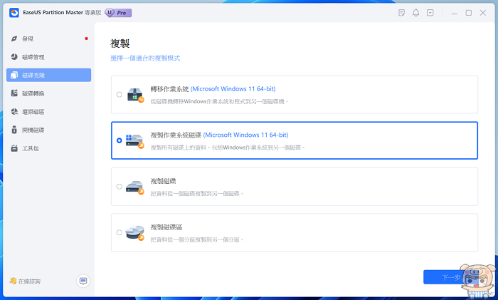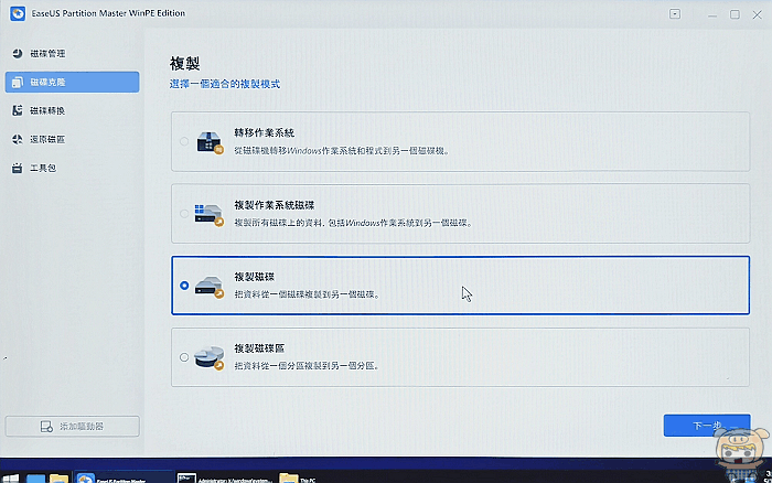 進入EaseUS Partition Master 程式後,點選磁碟克隆,裡面有四種複製的方式,「轉移作業系統」、「複製作業系統磁碟」、「複製磁碟」、「複製磁碟區」,因為目前小米就是想要把這台電腦上有作業系統的磁碟,複製到大一點的磁碟,所以選擇「複製作業系統磁碟」,點選「下一步」