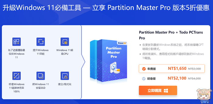 最後小米就介紹到這邊啦,如果你有更換電腦磁碟的需求,但又不想重灌系統,那您一定要來試試EaseUS Partition Master Professional ,只要簡單的操作,就能稿定作業系統的移轉不用重裝!另外如果需要格式化硬碟,磁碟,以及複製磁碟、系統移轉、MBR轉GPT磁碟,調整磁碟大小,程動分割區,合併磁碟、清理資料等需求,那你更需要來試試這套好用的 EaseUS Partition Master Professional 讓您快速又輕鬆的搞定!!目前5折優惠中,有需要的朋友要把握機會哦 EaseUS Partition Master Professional 下載連結:請點我請點我請用力點我!
