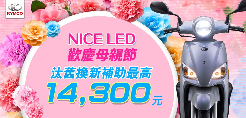 KYMCO 光陽母親節活動即日起全面展開!在這個特別的節日,光陽以 Nice LED、LIKE 125/150/Keyless 為辛苦的母親們獻上「媽媽騎好車」寵愛活動,最高補助達 14,300 元。
