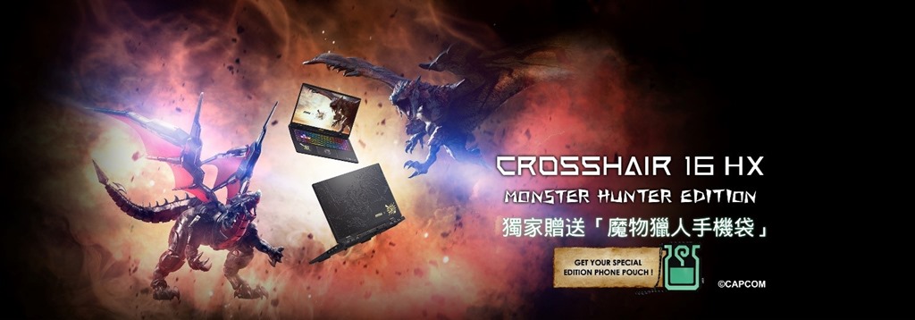 MSI Crosshair 16 HX Monster Hunter Edition 聯名電競筆電是《Monster Hunter》粉絲不可錯過的收藏逸品。除了擁有強悍效能與獨特外型之外,更限量贈送「魔物獵人手機袋」與電子現金,讓玩家盡情享受遊戲樂趣。