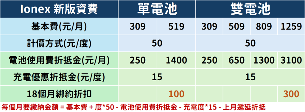 Ionex 新版資費架構其實只有四個項目要看,分別是基本費、計價方式、電池使用費折抵金與充電優惠折抵金。接下來會有一些計算,請大家搭配著底下資費表一邊看一邊算。