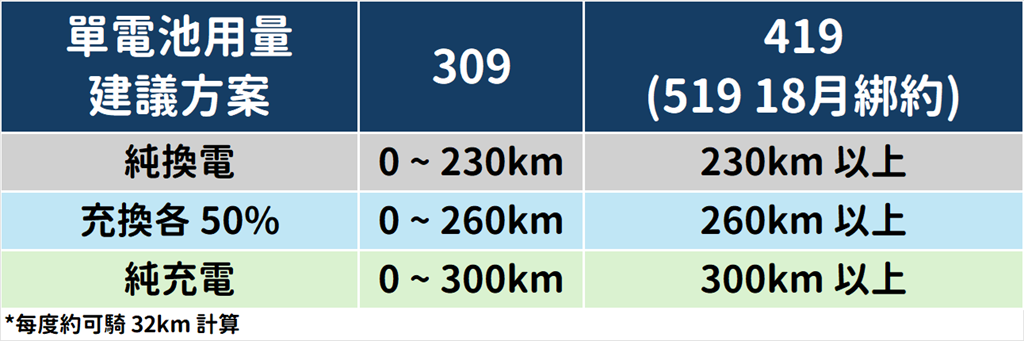 那要怎麼選資費呢?你可以依據騎乘習慣來選擇,以 Ionex 提供所有用戶的平均值來說,單電池版本車款一度電大約可以騎 32 公里、雙電池版約有 26 公里。以雙電池版本,都使用換電方式,如果每個月騎不到 234 公里,就選擇最便宜的 309 元、如果超過 234 公里就選 509。若每個月超過 494 公里,就選 809、超過 900 公里,就直接攻頂選 1259。