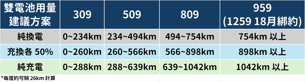 對了,上面表格還有 18 個月綁約折扣,非常建議長時間都騎超過 700 公里的朋友選用,因為有 300 元的基本費折抵,也就是月租只有 959 元,卻可享用 1259 的方案。如果居家適合充電,就可以騎更遠…好,我知道大家已經一頭霧水了,直接整理表格給大家。