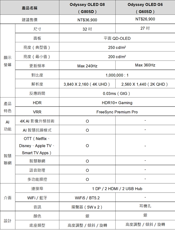 Odyssey OLED G8 擁有 240Hz 更新率、0.03ms(GTG) 反應時間,而 Odyssey OLED G6 則擁有 360Hz 更新率和0.03ms(GTG)反應時間。