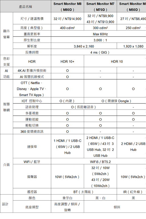 智慧聯網顯示器 Smart Monitor 系列,是兼具娛樂與專業的多功能顯示器,這次新推出的 Smart Monitor M8 為搭載 AI 功能機種,全新 4K AI 影像升頻技術提升較低畫質的影片內容,達到近 4K 的畫質。而 AI 智慧抗噪模式則可偵測外部噪音,當環境音過大時,能自動提高顯示器中對話的清晰度。