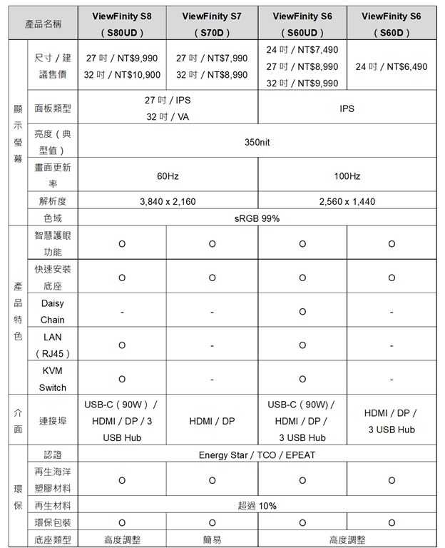 這次共推出 ViewFinity S80UD、S70D、S60UD 和 S60D 四款機型。最高支援 4K 解析度或 100Hz 更新率,而 ViewFinity S80UD 和 S60UD 具備 90W USB-C 接口,高達 90 瓦的快充,可為筆記型電腦及顯示器快速充電,提升工作效率