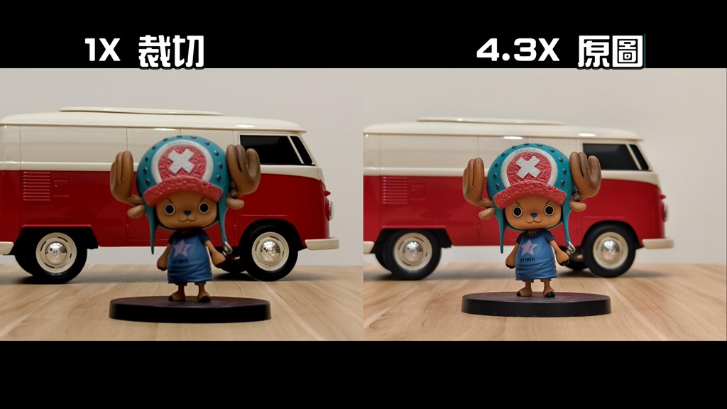 而將照片裁切也是有一樣的問題,就像使用 1X 與 4.3X 在同距離拍下照片,雖然 1X 裁切後與 4.3X 有同樣的壓縮感,但在畫質與解析度上就會差很多。