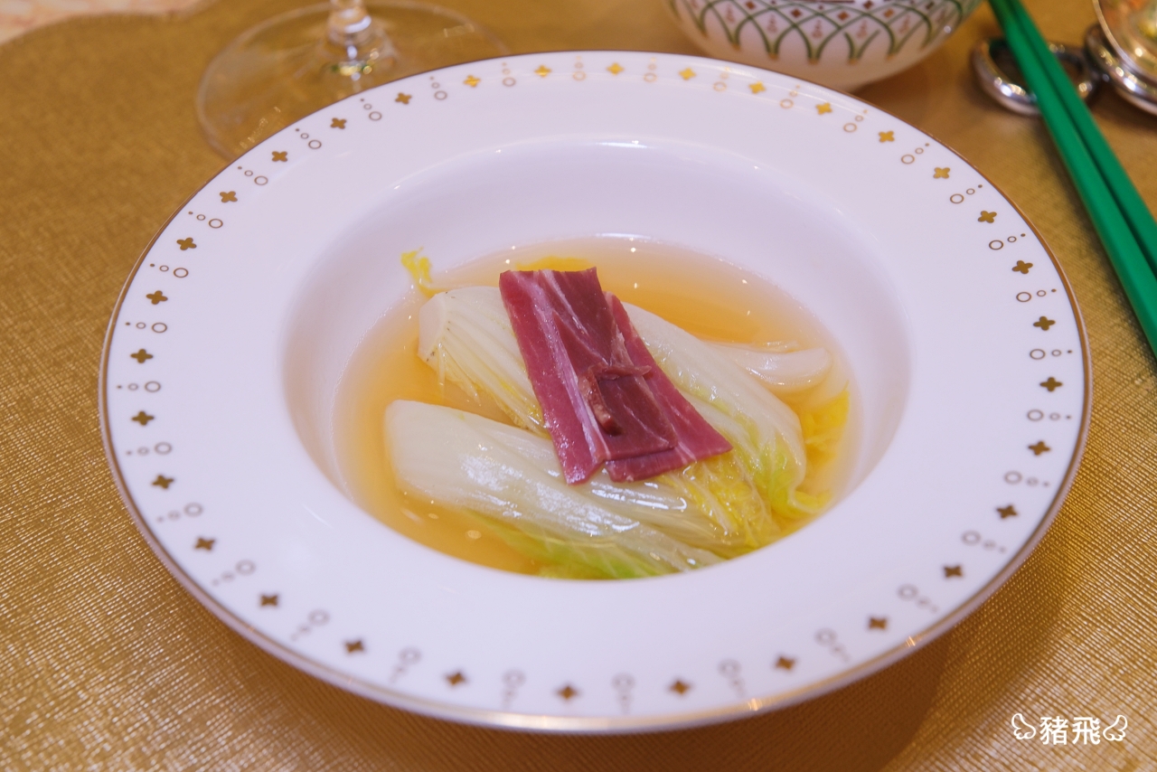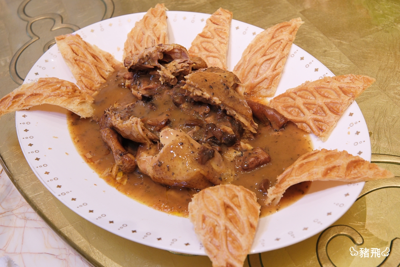 你們是不是以為這是威靈頓牛排,其實是由經典叫花雞搖身一變而成的升級版。八寶富貴雞是永翠宮的一道經典名菜,象徵富貴與吉祥。這道菜選用優質雞肉,烤至骨頭可以輕易剪開,淋上菌菇醬汁、新鮮現刨黑松露,搭配酥皮一起食用,是東方菜裡的的威靈頓牛排(笑)。食材的鮮香味道充分融合在一起,充滿創意與美味。