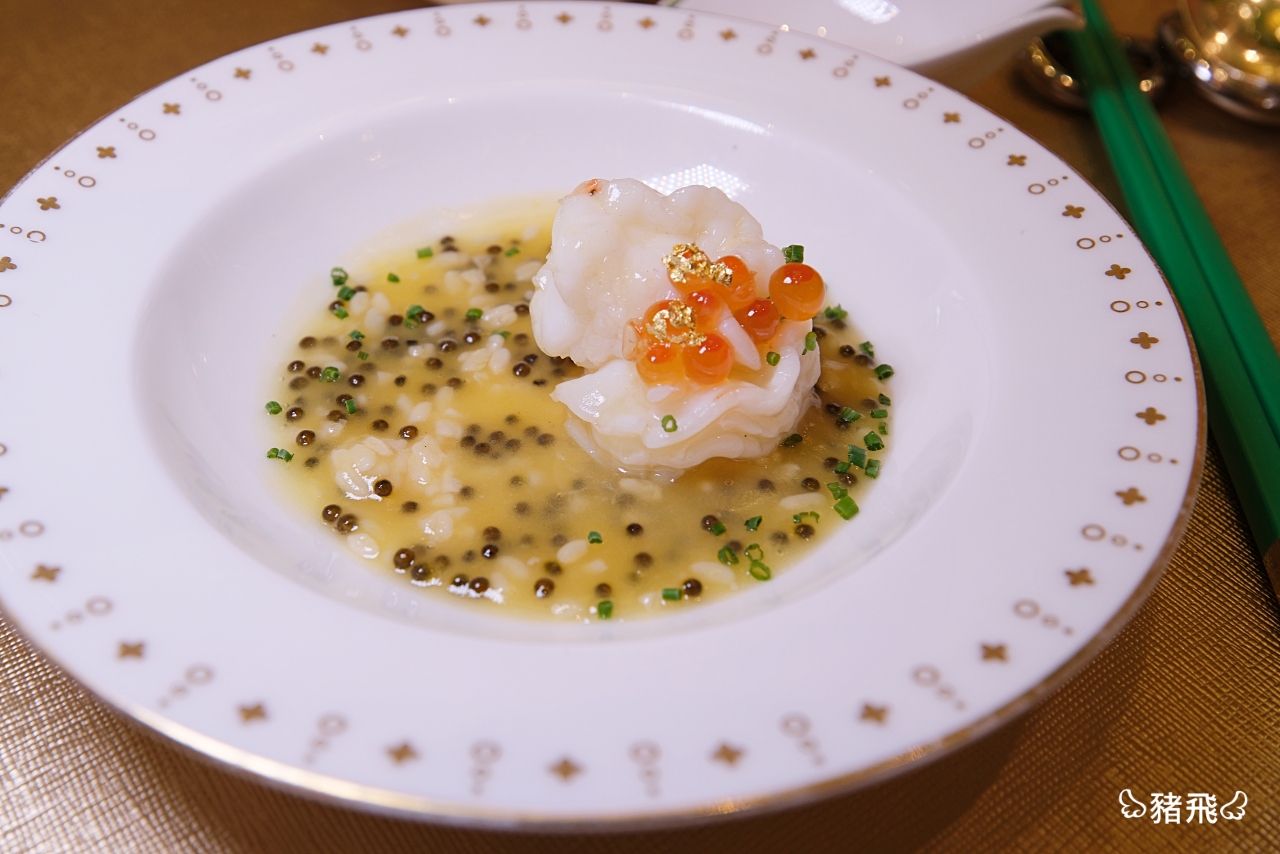 選用新鮮的泰國大虎蝦,以糟滷汁混合黃金魚子醬製成醬汁,經過精心烹製而成。剔除紅色薄膜的蝦球外脆內嫩,魚子的獨特風味與明蝦的鮮甜完美融合,口感豐富且層次分明,馥郁醇厚的酒香讓整體風味提升。這道菜不僅視覺上美觀,味道也讓人難以忘懷。
