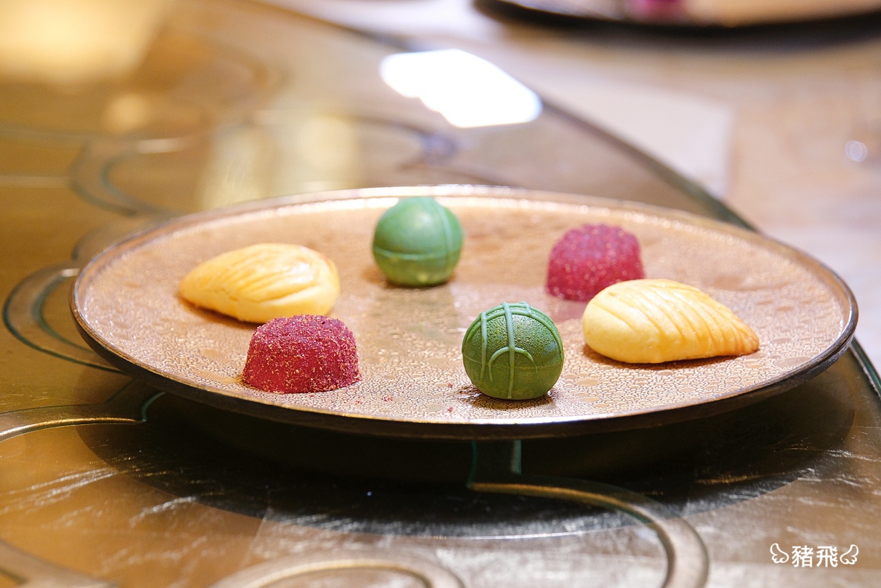 最後當然需要用甜點收尾才能為今日的美食佳餚劃下完美句點,由主廚招待的手作甜品,軟糖(紅)、造型鳳梨酥(黃)、青花椒巧克力(綠),小巧可愛的造型,剛剛好的份量。