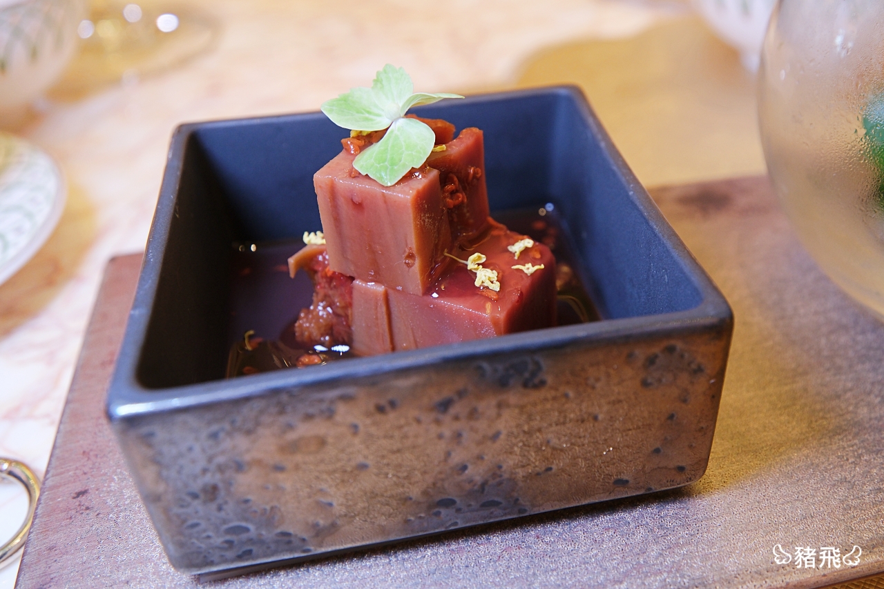 江南地區一道經典蘇浙前菜,選用新鮮的蓮藕將糯米灌在蓮藕中,煮至軟糯,再以特製桂花糖漿和紅酒麴醃製,桂花的清香與蓮藕的脆相得益彰,加上包裹在裡面的甜糯米,實在很令人喜歡。