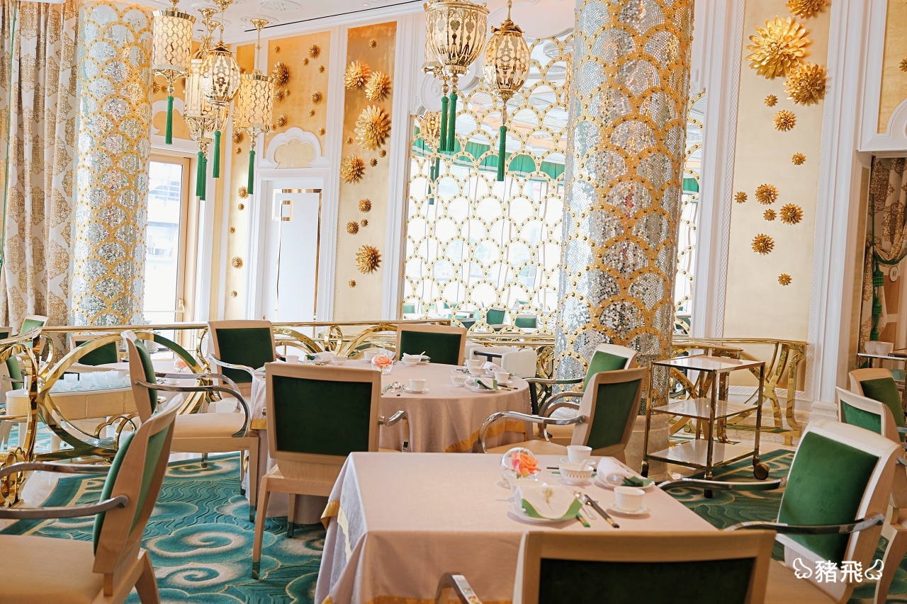 裝潢以金、白、綠三色為主調,從門口巨型裝飾花瓶就可以感受到獨特魅力,天花板的精細花紋、柱子上的細緻線條、空間裡的奢華吊燈,光是空間就讓人手機拍不停,實在是漂亮極了。