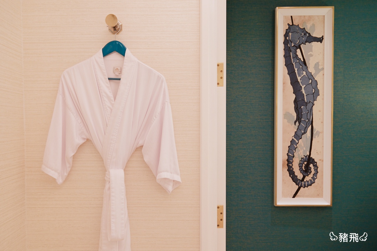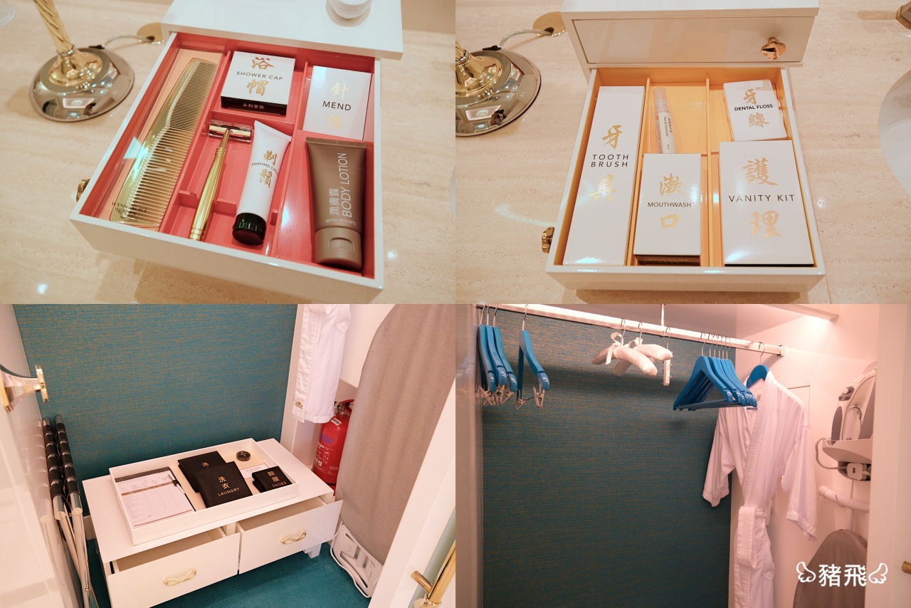 ▲浴室門口設置了貼心行李櫃,進房前行李服務員已經把行李放好了,好貼心。浴室備品準備的很齊全,設計是啵拎啵拎得閃亮金,衣櫃內備有送洗袋、燙衣板、熨斗等等,連衣架都是藍色耶。