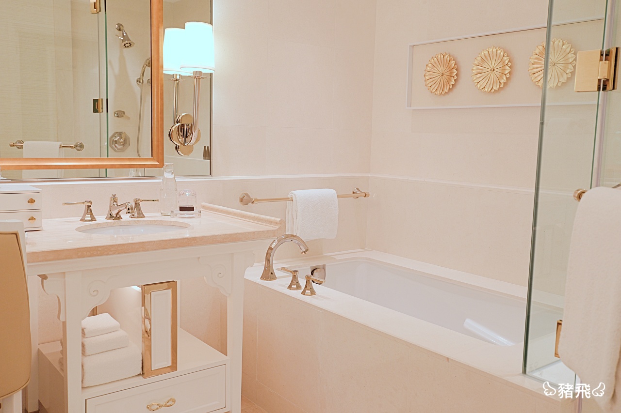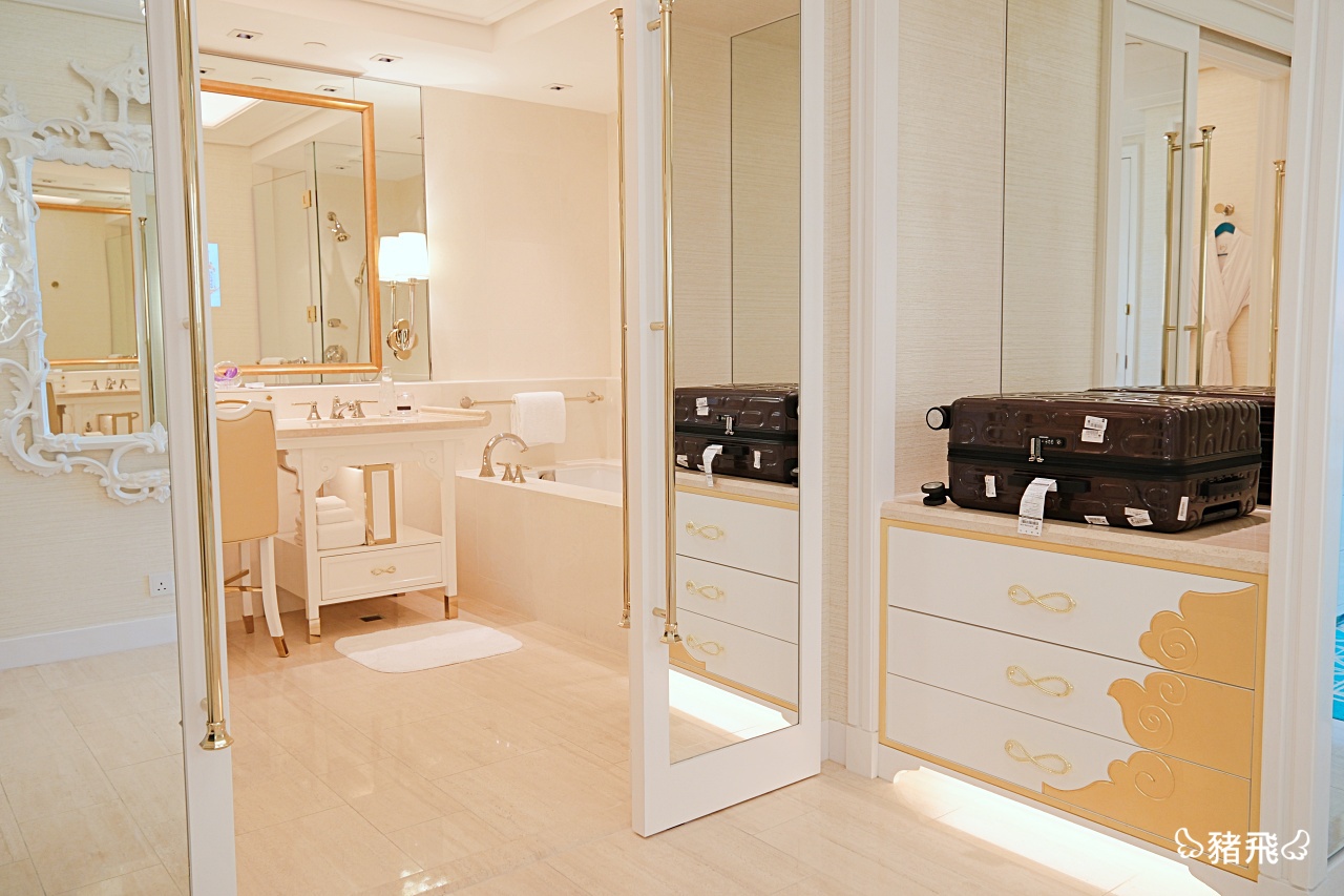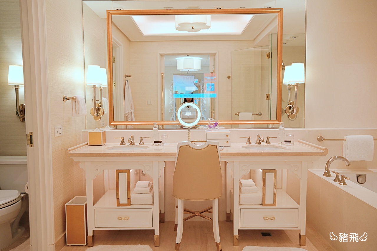 又是讓人睜大眼睛的超大浴室,大概快跟房間一樣大了吧!永利皇宮真的是把住宿體驗打造成皇宮了,獨立淋浴間、泡澡浴缸、廁所,並提供高級洗浴用品,有個梳妝台對女生而言超級貼心,是豬飛夢想中的浴室設計啊。