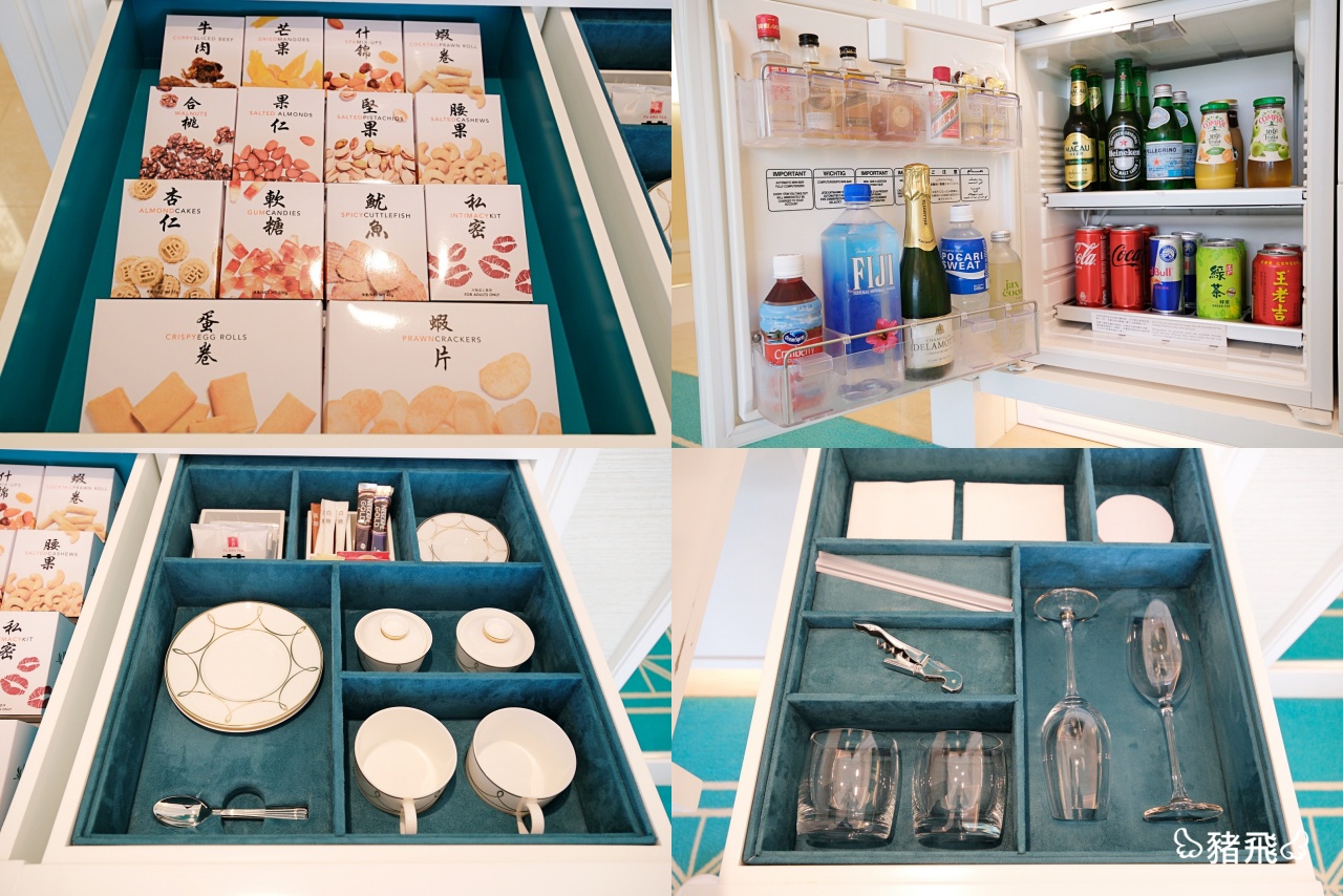 ▲mini bar擺滿各式零食,冰箱內也是滿滿飲料,以上這些是需要另外付費的。咖啡杯、茶包、即溶咖啡包、玻璃杯,一應俱全。