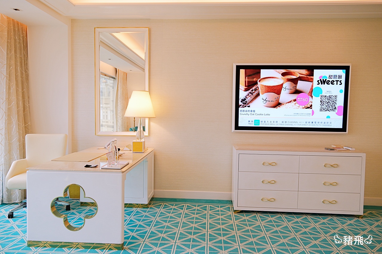 ▲書桌上已經擺好迎賓水果跟飯店內甜品專賣店「甜藝廊」的手工巧克力。這水果跟巧克力好好吃,立刻秒殺。
