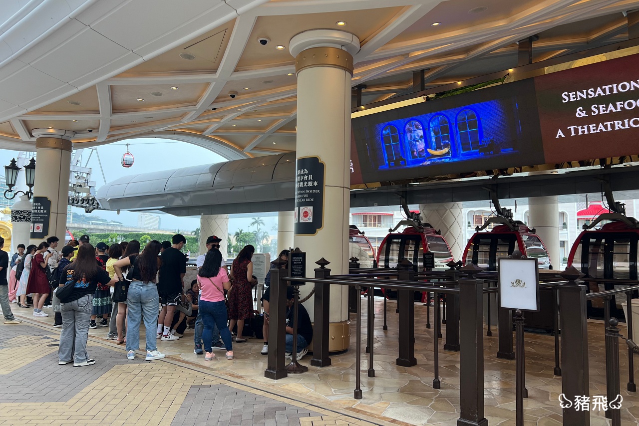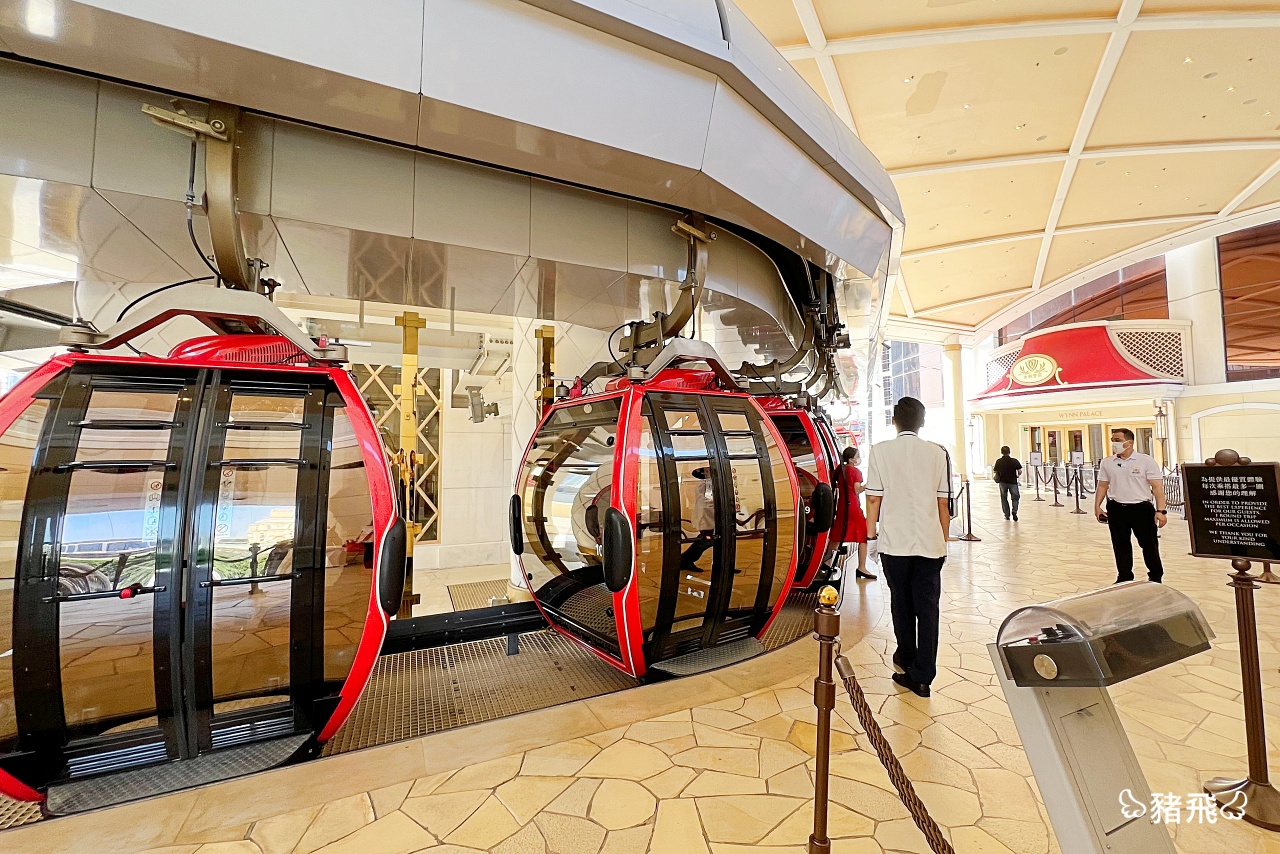 免費搭乘的空中纜車是永利皇宮一大賣點!來到澳門旅遊千萬別錯過。搭乘位置就在體育館大馬路上,每天都有排隊人潮,平日等待時間不會太久,大約15-20分鐘,假日會等比較久。