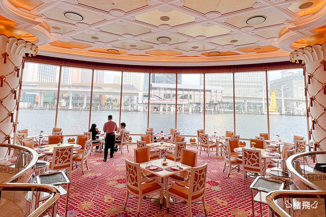 空間設計如同酒店奢華風格,以紅色、白色、金色為主,揉合中西風格,展現出新古典宮廷的中國風,圓柱上交錯的金色線條,天花板高掛的中國風燈籠,地毯是活潑花朵意象,最熱門的靠窗區可以看到水舞秀以及空中纜車。