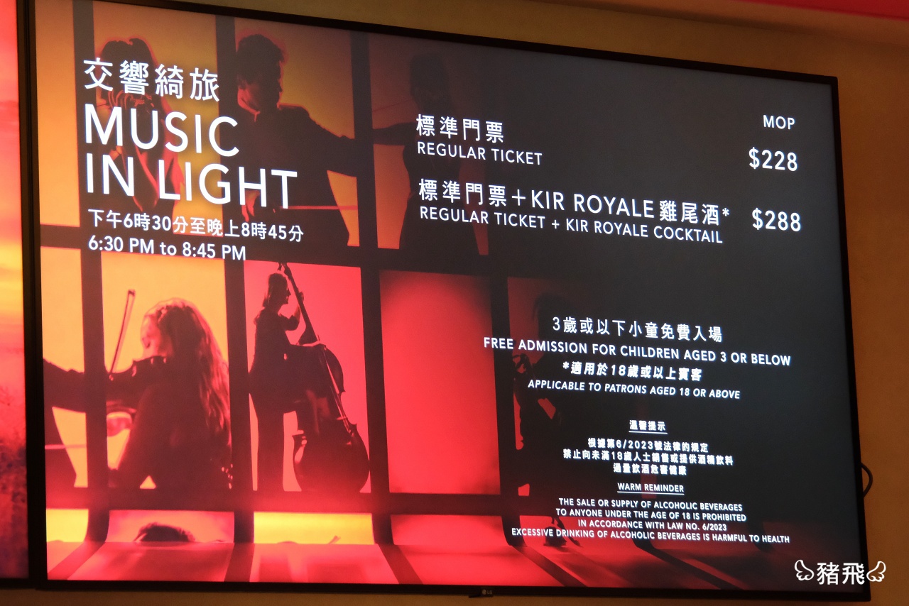 - 標準門票連 Kir Royale 雞尾酒:澳門幣 288 元(適用於 18 歲或以上賓客,票價包括入場門票一張及經典 Kir Royale 雞尾酒一杯)