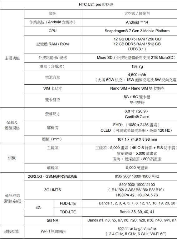 HTC U24 pro 推出太空藍與暮光白兩款配色,有著 12GB / 512GB 與 12GB / 256GB 兩規格。處理器部分採用 Snapdragon 7 Gen 3,有著 4600mAh 電量,支援 60W 快充。