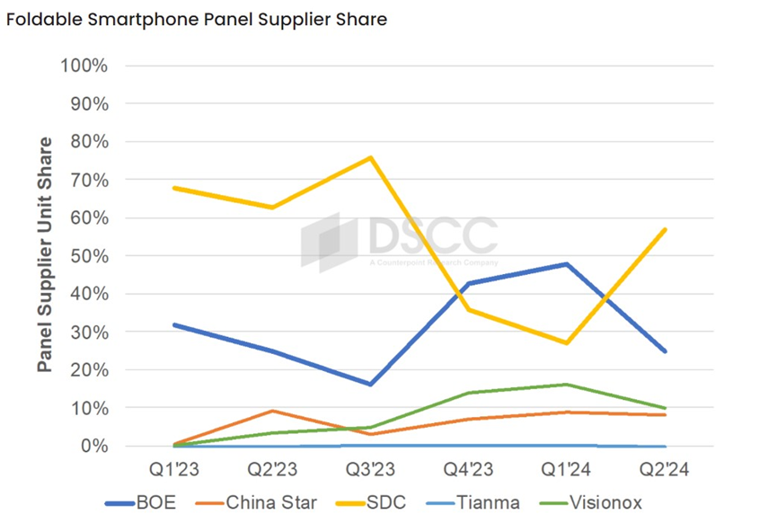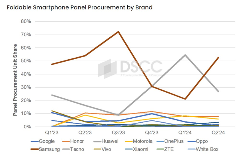 這樣的提升,也讓連續落後 BOE 京東方兩季摺疊面板出貨量的 SDC 三星顯示,將在 2024 Q2 重回領先地位。而以手機品牌對摺疊螢幕採購量,三星也再次超車華為回到市場第一。