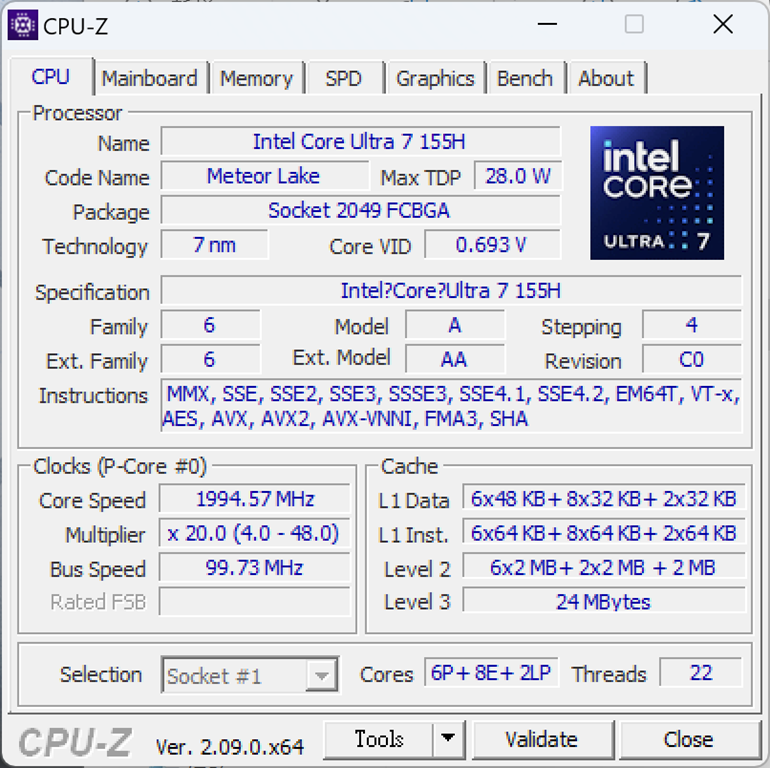 從 CPU-Z 可以看到 CPU 資訊,採用16 核心,也就是 6 P-core、8 E-Core 搭配 2 LP-core 的架構,並搭配 24MB L3 快取記憶體。