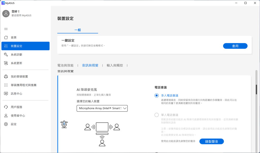如果有視訊會議需求,可以從 MyASUS 裡啟用 AI 降噪麥克風功能,還可以選擇會議情境是多人會議或是單人會議,多人電話會議會收錄四面八方的人聲、降低環境噪音,如果是單人的話,則可先錄一段自己的聲音讓 AI 認識,接著在線上會議的過程就會讓自己的聲音更清晰。