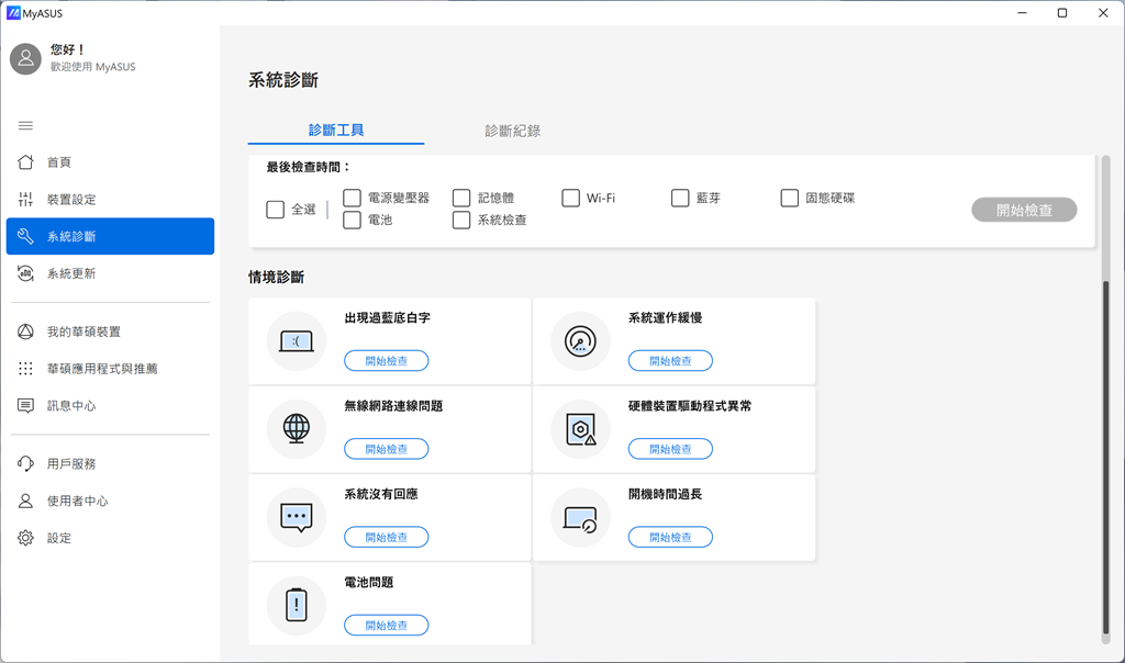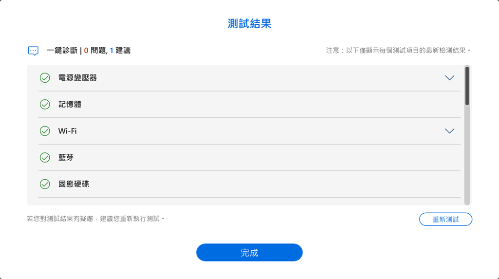 最方便的則是系統診斷功能,有時候筆電用久了,有些地方可能會出現一些問題,這時透過系統診斷功能就可以先初步自己解決,不用找 IT 來幫忙。
