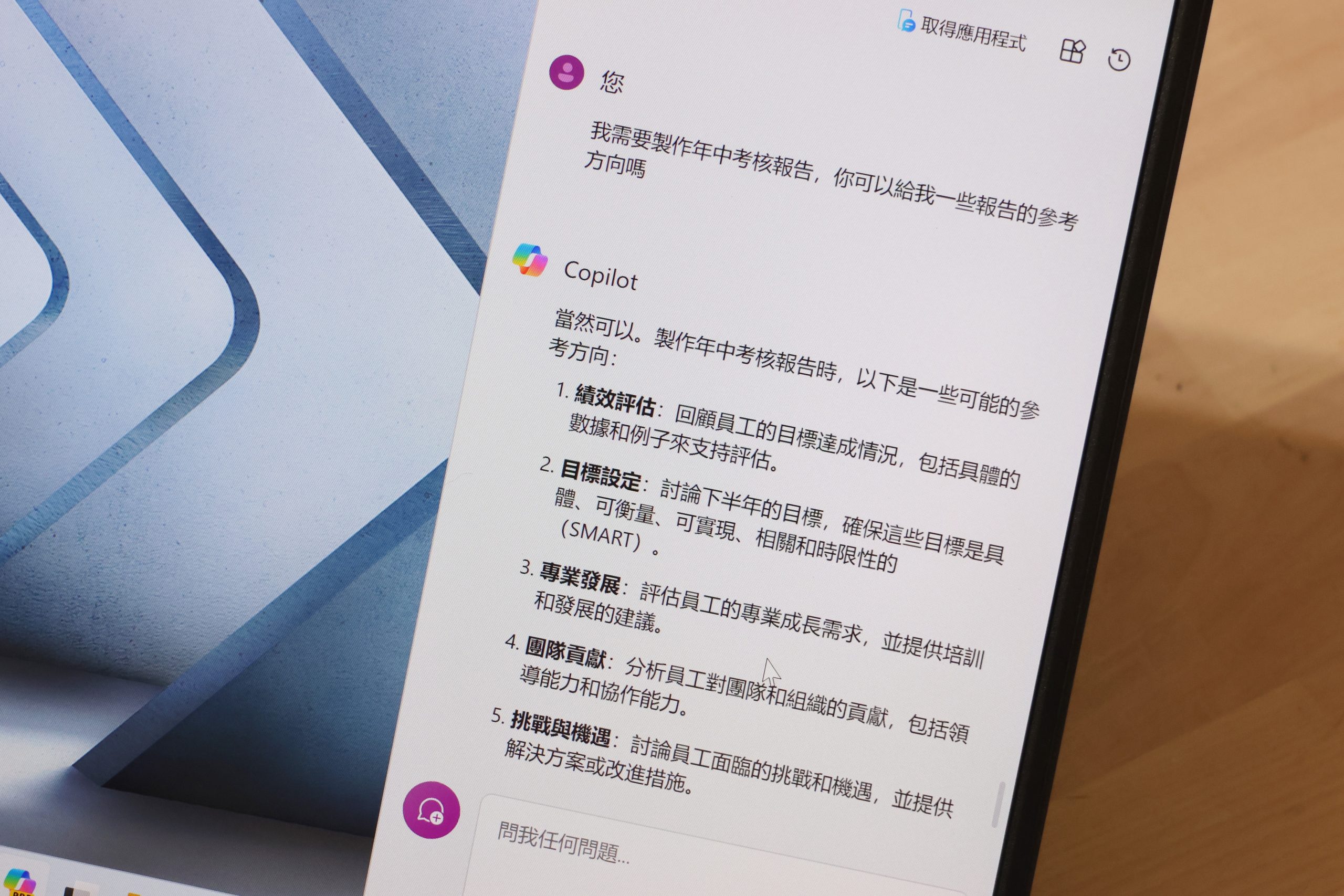 另外像是最近不少公司都在製作年中考核報告,也可以請 Copilot 協助生成報告的雛形,在沒有靈感的時候可以藉由這個方式起頭,寫起報告來比較不容易卡關。