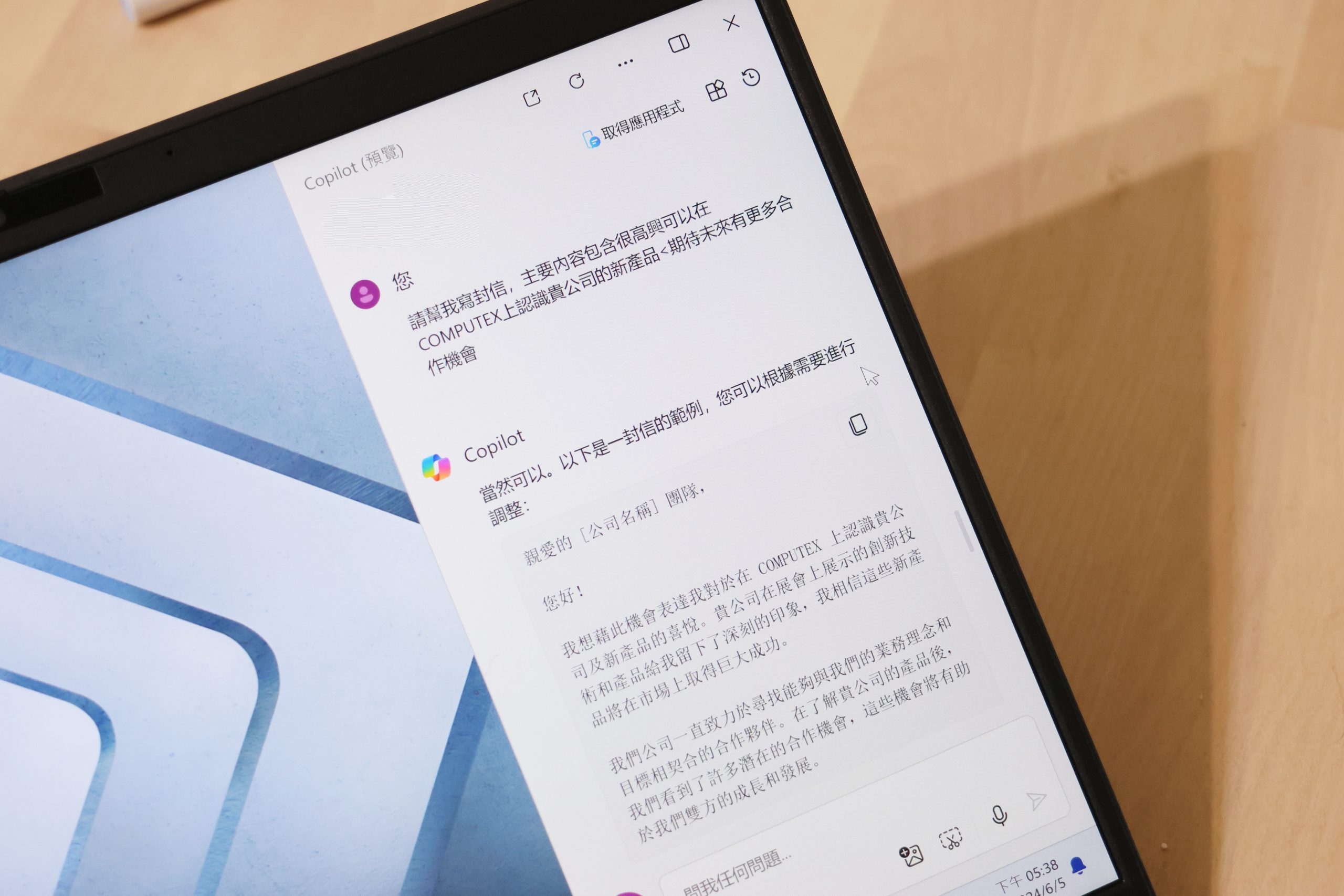 或是說像在 COMPUTEX 電腦展上有遇到潛在合作客戶,要寫信給對方留下聯絡資料時,就可以請 Copilot 幫忙草擬信件,如果語氣跟內容要調整的話可以直接透過對答的方式請 Copilot 微調,調整完之後直接複製貼到郵件裡就可以了。