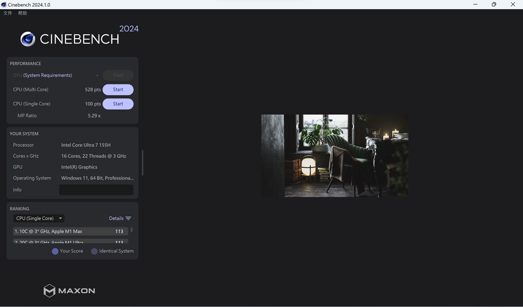 Cinebench 2024 測試 CPU 多核成績為 528 分、單核成績為 100 分。